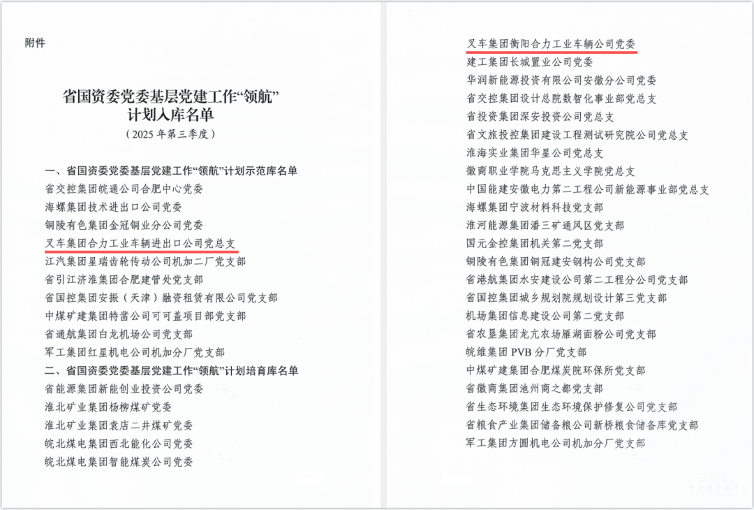 安徽叉車集團黨委兩個黨組織分別入選省國資委黨委基層黨建工作“領航”計劃示范庫、培育庫